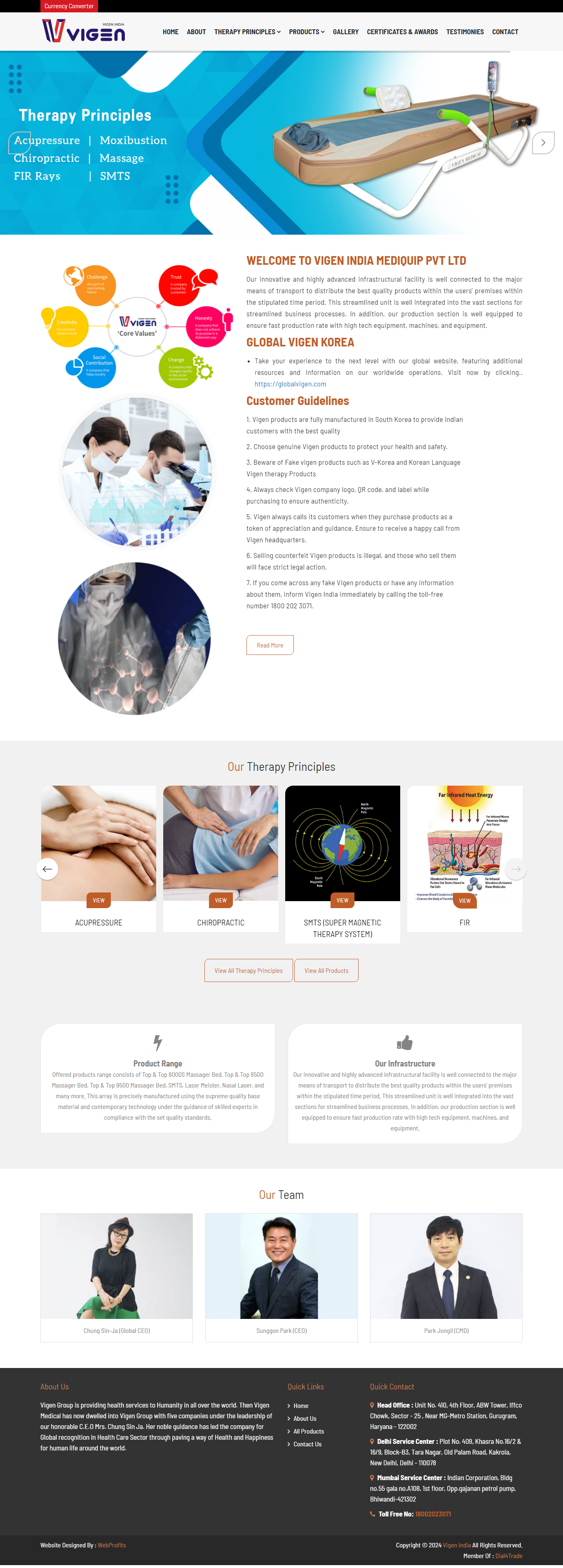 Webprofits assists Vigen India Mediquip Pvt Ltd by providing a web application and SEO services, which helps to rank their keywords such as HUE GRATHING SINGLE, COA BEAM, etc. on the first page of search engines. It is a manufacturing and supplying company that offers a range of products including Automatic Thermal Massagers such as Top & Top 8500, Top & Top 8000S, and Top & Top 9500, as well as SMTS Mats, Vigen Champ Mats, Hue-Grathing Multi Mats, Smart Lasers, Laser Meisters, Coa Beams, and more. These products are widely used in clinics, hospitals, corporate houses, and for personal use.